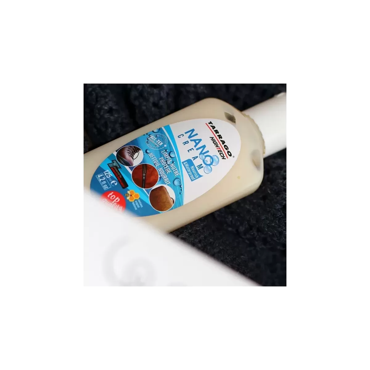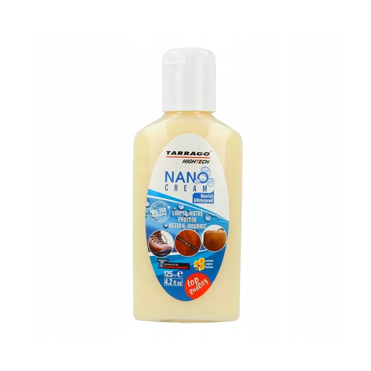 Tarrago Nano Cream to nowoczesna pielęgnacja skóry oparta na nanotechnologii – zawiera 31 % wosku pszczelego, co zapewnia skórze miękkość, odporność na zabrudzenia. Dodatkowo posiada unikalną dla Hiszpańskiej marki formułę podnoszącą wodoodporność powierzchni zewnętrznej skóry. Dzięki temu przygotowanie skóry do warunków pogodowych staje się szybkie i skuteczne. Idealny do gładkich skór High‑Tech, nie nadaje się do zamszu, nubuku ani materiałów tekstylnych.