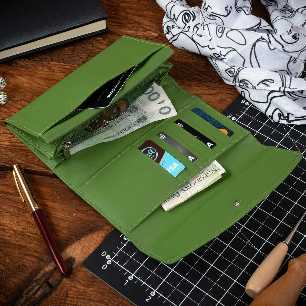 “Średni portfel w żywym odcieniu zieleni to doskonały przykład polskiego rzemiosła. Miękka skóra, czyste wykończenia i funkcjonalność idą w parze, dając produkt, który towarzyszy latami.”