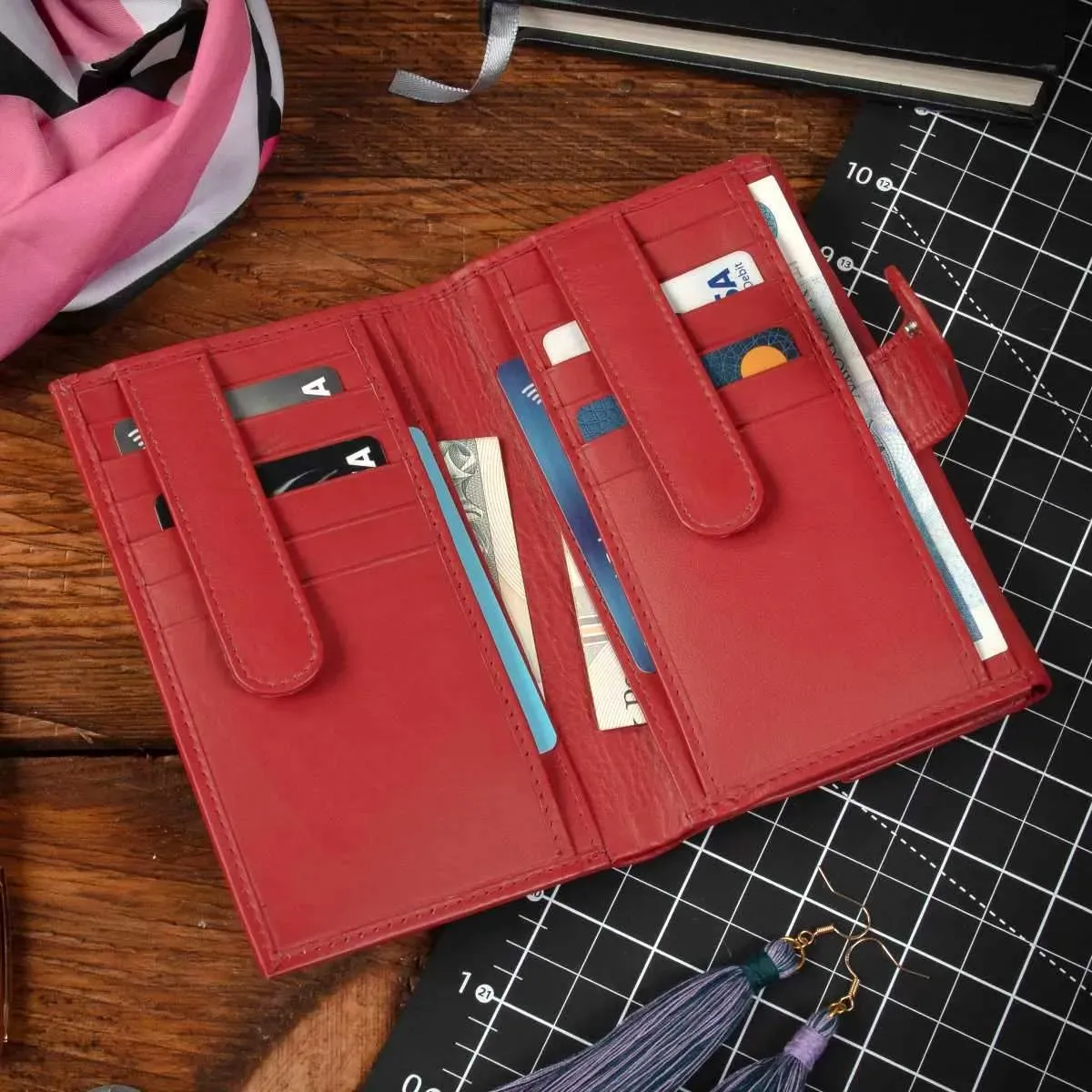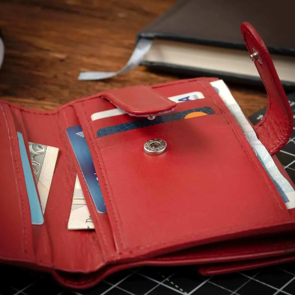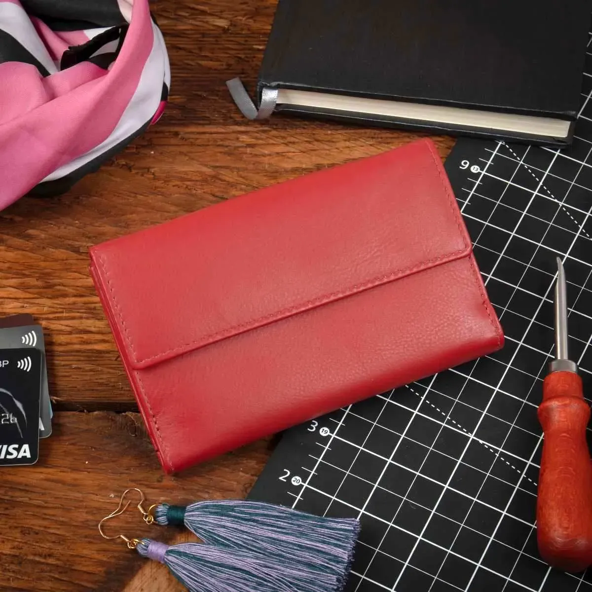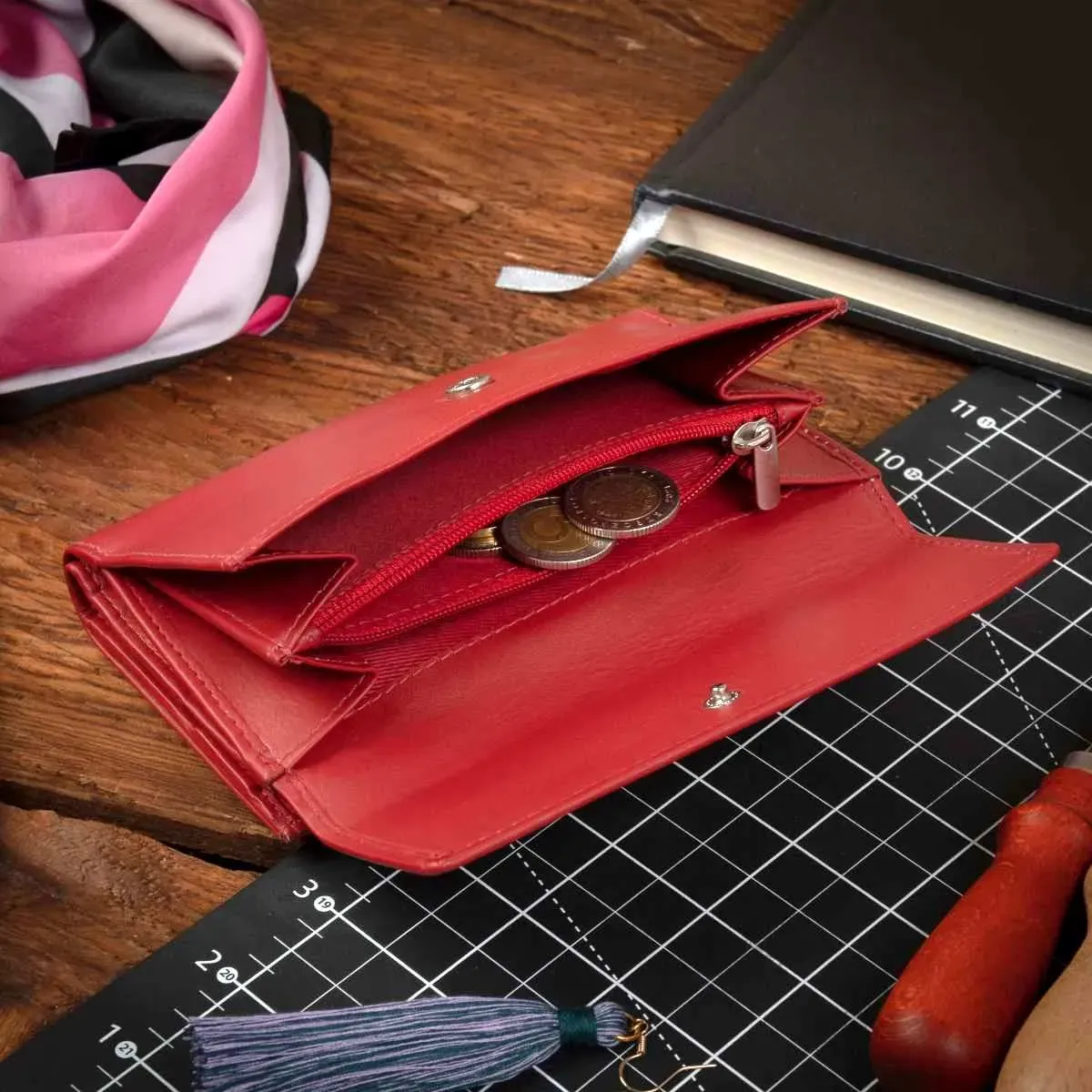 Średni portfel damski W043 z miękkiej skóry naturalnej w krwistej czerwieni łączy elegancki wygląd z wnętrzem, które pomaga utrzymać świetną organizację.